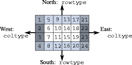 and south rows and the west and east columns of a