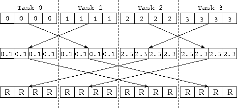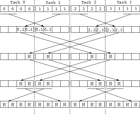 Figure 11.1: Using the hypercube algorithm to reduce four vectors of length N=4 distributed among four tasks. The computation is performed in steps, with each task in each step exchanging N data values with a neighbor and performing N combine operations. The labels in the boxes denote the origin of the values that they contain; hence, 0.1 and 2.3 represent intermediate results obtained when contributions from task 0 and 1, or 2 and 3, are combined. R represents the final reduced values.