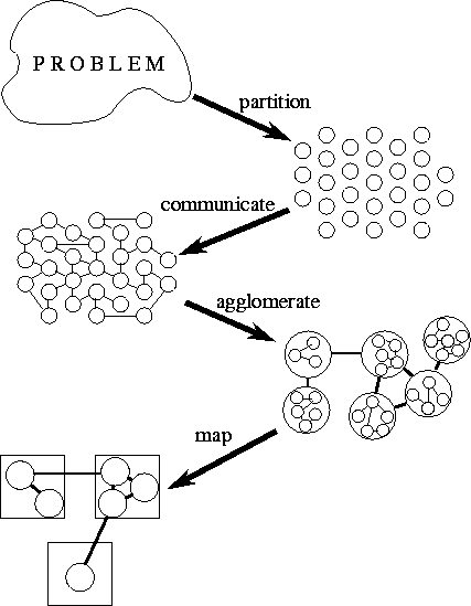 Most programming problems have several parallel solutions. The best solution may differ from that suggested by existing sequential algorithms. The design methodology that we describe is intended to foster an exploratory approach to design in which machine-independent issues such as concurrency are considered early and machine-specific aspects of design are delayed until late in the design process. This methodology structures the design process as four distinct stages: partitioning, communication, agglomeration, and   mapping. (The acronym PCAM may serve as a useful reminder of this structure.) In the first two stages, we focus on concurrency and scalability and seek to discover algorithms with these qualities. In the third and fourth stages, attention shifts to locality and other performance-related issues. The four stages are illustrated in Figure 2.1 and can be summarized as follows: