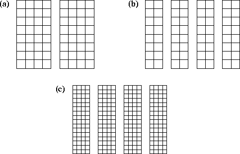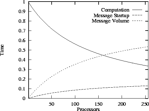 Poor performance may be due to excessive replicated computation, idle time, message startups, data transfer costs, or some combination of these factors. An important first step when attempting to improve an algorithm is to identify which of these factors is dominant. We can do this by computing an expected execution profile for the algorithm, indicating the contributions of these different factors to execution time as a function of N and/or P . This approach is illustrated in Figure 3.8 for the 1-D finite difference algorithm. The model predicts that when this algorithm is executed on a multicomputer with a single vertical layer ( Z=1 ), data transfer costs dominate execution time when P is large; message startup costs are also significant. If the number of vertical levels is increased, message startup costs become negligible, and overall efficiency improves.