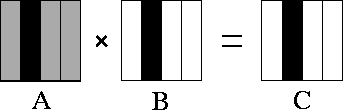 Figure 4.10: Matrix-matrix multiplication A.B=C with matrices A , B , and C decomposed in one dimension. The components of A , B , and C allocated to a single task are shaded black. During execution, this task requires all of matrix A (shown stippled).