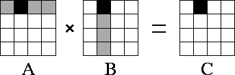 Figure 4.11: Matrix-matrix multiplication A.B=C with matrices A ,   B , and C decomposed in two dimensions. The components of A , B , and C allocated to a single task are shaded black. During execution, this task requires corresponding rows and columns of matrix A and B , respectively (shown stippled).