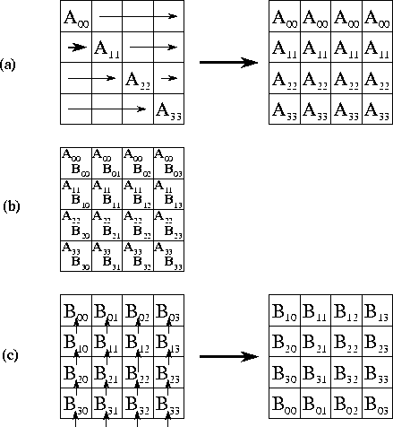 Figure 4.12: Matrix-matrix multiplication algorithm based on two-dimensional decompositions. Each step involves three stages: (a) an A submatrix is broadcast to other tasks in the same row; (b) local computation is performed; and (c) the B submatrix is rotated upwards within each column.