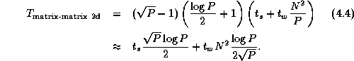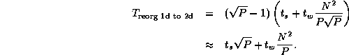 Comparing Equations 4.3 with 4.4,   we see that the two-dimensional decomposition yields the more efficient parallel algorithm. Does this mean that our parallel library should convert input arrays decomposed in one dimension to a two-dimensional decomposition before performing the matrix multiplication? To answer this question, we need to know the cost of the reorganization. The communication costs associated with the reorganization of a single array are as follows; each task exchanges data with other tasks, with each message having size (Figure 4.13):