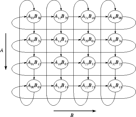 Computation proceeds in steps. In each step, contributions to C are accumulated in each task, after which values of A move down and values of B move right. The entire computation requires a total of messages per task, each of size , for a cost of