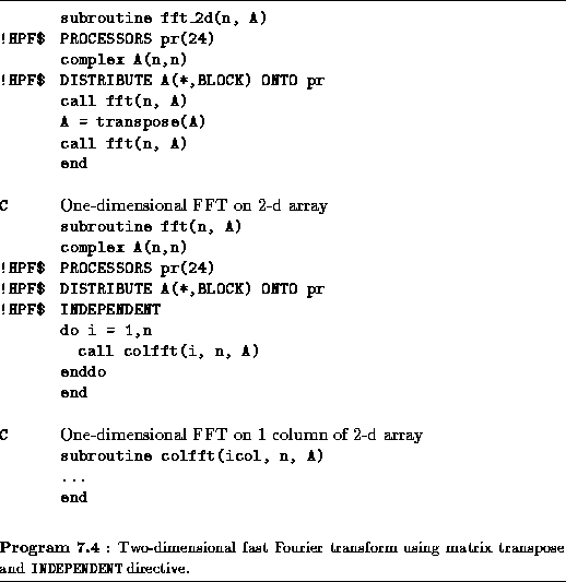 A 2-D FFT applies a 1-D FFT operation first to each column of a two-dimensional array and then to each row. An initial column distribution allows the first set of FFTs to proceed without communication; the array is then transposed before performing the second set of FFTs. (A similar technique is used in Section 4.4, but here we distribute by column to improve locality in a Fortran implementation.) The transpose involves considerable communication but is frequently more efficient than an algorithm based on a static decomposition and parallel FFTs. Program 7.4 implements the transpose algorithm. Notice the initial distribution of A (blocked, by column) and the call to the transpose intrinsic. Notice also the use of the INDEPENDENT directive to specify that the colfft calls in the do-loop can proceed independently, even though each is passed the entire A array. This assertion is valid because each call to colfft operates on a single column.
