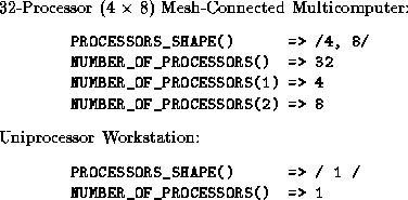 HPF introduces a small set of intrinsic functions in addition to those defined in F90. The two most relevant to parallel program design are the system inquiry functions NUMBER_OF_PROCESSORS and PROCESSORS_SHAPE. These functions allow a program to obtain information about the number of physical processors on which it executes and the topology connecting these processors. This information can be used to write programs that run efficiently on varying numbers of processors and processor configuration. The functions are modeled on the F90 inquiry functions SIZE and SHAPE, respectively, and provide a view of the underlying computer as a rectilinear, multidimensional processor array. A call to NUMBER_OF_PROCESSORS has the general form NUMBER_OF_PROCESSORS(dim)