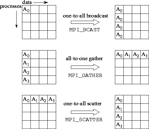 MPI_BCAST, MPI_GATHER, and MPI_SCATTER are collective data movement routines, in which all processes interact with a distinguished root process to broadcast, gather, or scatter data, respectively. The operation of these functions is illustrated in Figure 8.3. In each case, the first three arguments specify the location ( inbuf) and type ( intype) of the data to be communicated and the number of elements to be sent to each destination ( incnt). Other arguments specify the location and type of the result ( outbuf, outtype) and the number of elements to be received from each source ( outcnt).
