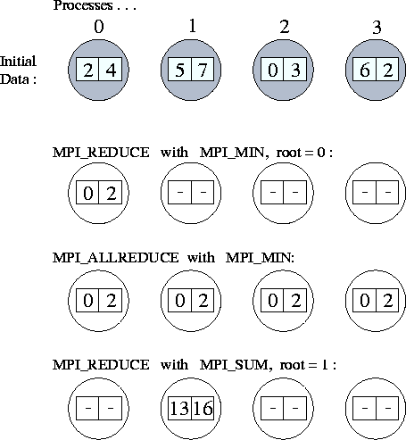 Figure: Applications of MPI_REDUCE and MPI_ALLREDUCE.
