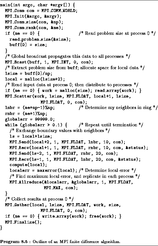 Once again we consider a finite difference problem, this time to illustrate the use of global operations. The algorithm considered requires both nearest-neighbor communication (to exchange boundary values) and global communication (to detect termination). Similar problems have previously been discussed in Chapter 2. The MPI implementation given in Program 8.5 is for a one-dimensional decomposition of a one-dimensional problem in which each process has two neighbors. It uses MPI_SEND and MPI_RECV for nearest-neighbor communication and four MPI global communication routines, for a total of five distinct communication operations. These are summarized as follows and are illustrated in Figure 8.5: