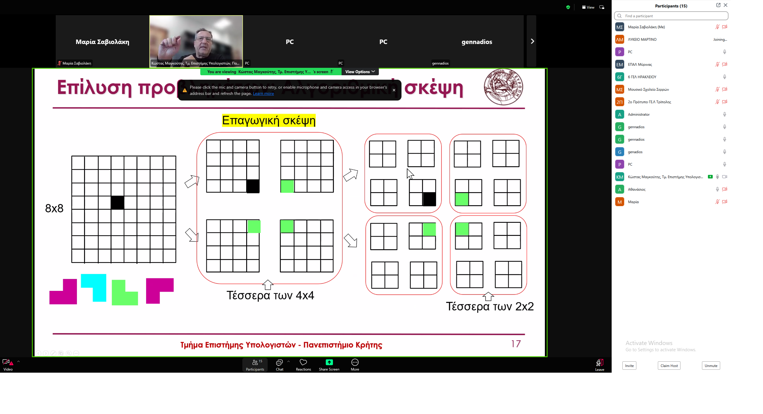 | 09:15 – 09:45 | «Ο κόσμος του Τμήματος Επιστήμης Υπολογιστών του Πανεπιστημίου Κρήτης» Παρουσίαση από τον Πρόεδρο του Τμήματος Κωνσταντίνο Μαγκούτη |